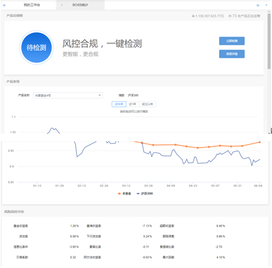 • BOSS統(tǒng)計(jì):專門(mén)針對(duì)領(lǐng)導(dǎo)層設(shè)計(jì)的產(chǎn)品總規(guī)模、產(chǎn)品表現(xiàn)、風(fēng)險(xiǎn)指標(biāo)分析檢測(cè)頁(yè)面。